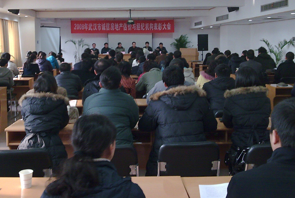 武汉市国土资源和房产管理局市场处处长耿宏诚等有关领导及武汉市房地产估价师协会副会长潘世炳等出席了会议,来自全市100多家房地产估价机构和经纪机构代表也参加了此次表彰大会。会议介绍了本次评选过程及规则,在公平、公正、公开的基础上进行了现场评选,并表彰了评选出的38家“2008年度诚信房地产估价与经纪机构”。