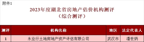 2024年10月1日,湖北省房地产业协会发布“2023年度湖北省房地产估价机构业绩测评结果”。此次测评涵盖了总营业收入、房地产估价业务收入、咨询业务收入等多个关键指标,永业行在测评中综合排名第一,同时名列营业收入、房地产估价业务收入、年纳税总额、咨询业务收入、注册房地产估价师人数等多个单项第一。